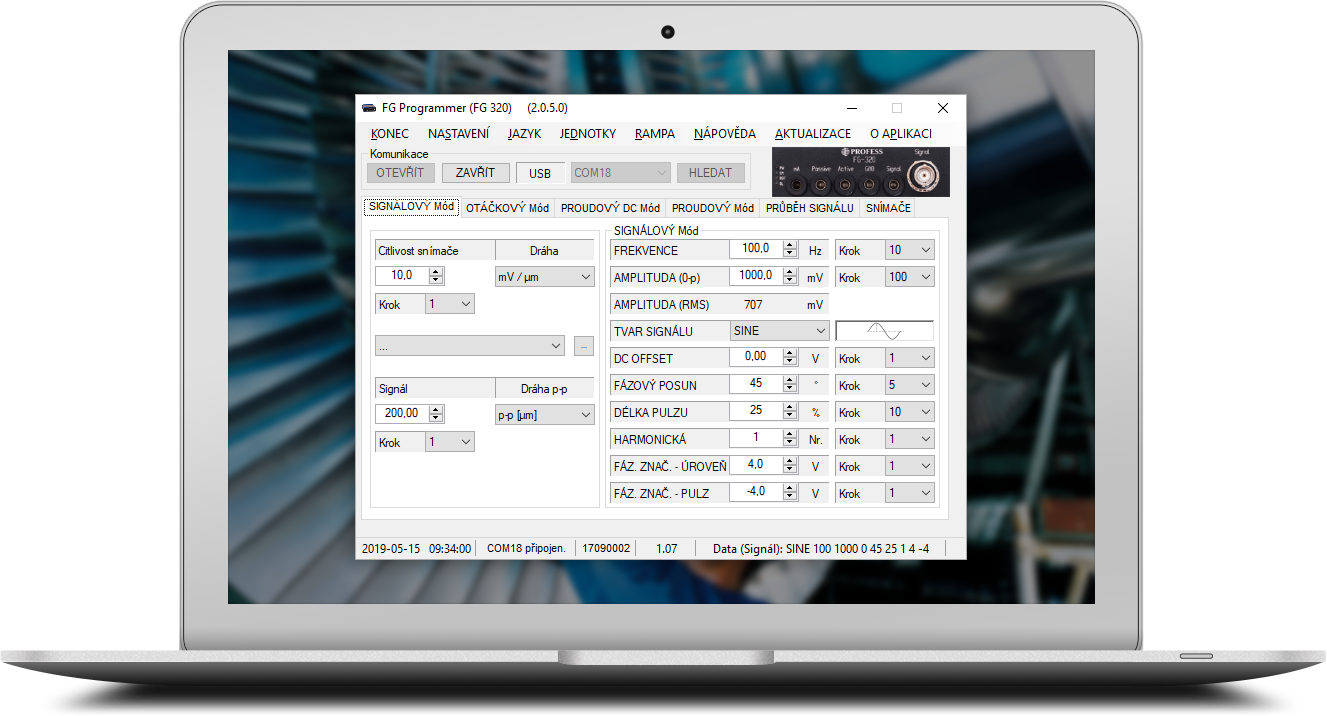 Konfiguračním nástrojem je speciální, uživatelsky přívětivý a dostupný software - FG programmer. S jeho pomocí lze snadno nastavit uživatelské signály. Je možné vybírat z databáze vibračních snímačů, uložit si uživatelský signál, nastavit rampu nebo zobrazit výstupní signál. Do programu jsou průběžně přidávány nové funkce a jeho aktualizace probíhá automaticky.
